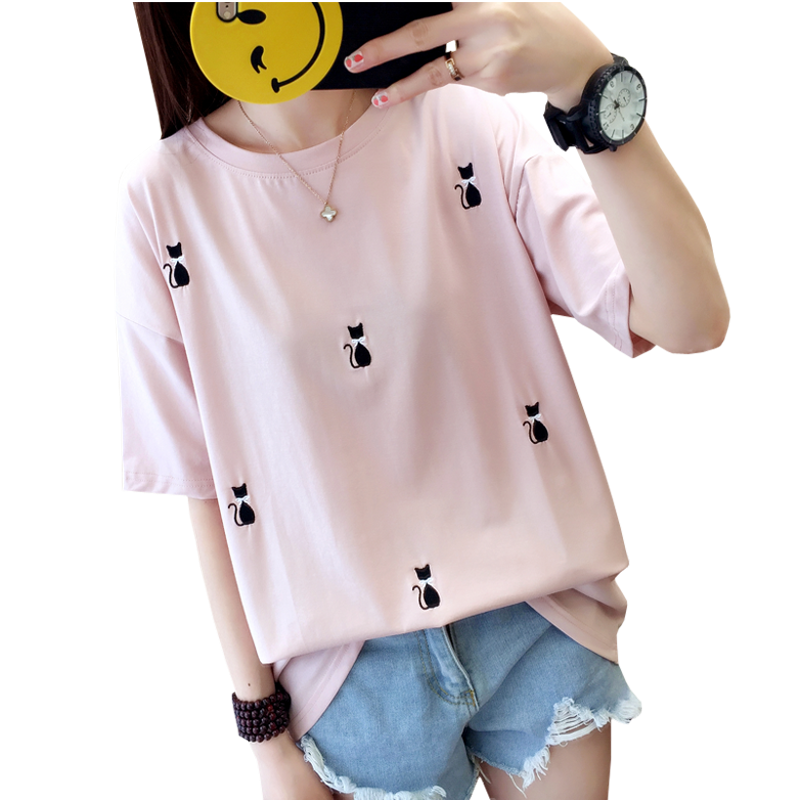 Kaos T Shirt Wanita Lengan Pendek Dengan Gambar Motif Kucing Dan Hiasan Bordir Shopee Indonesia