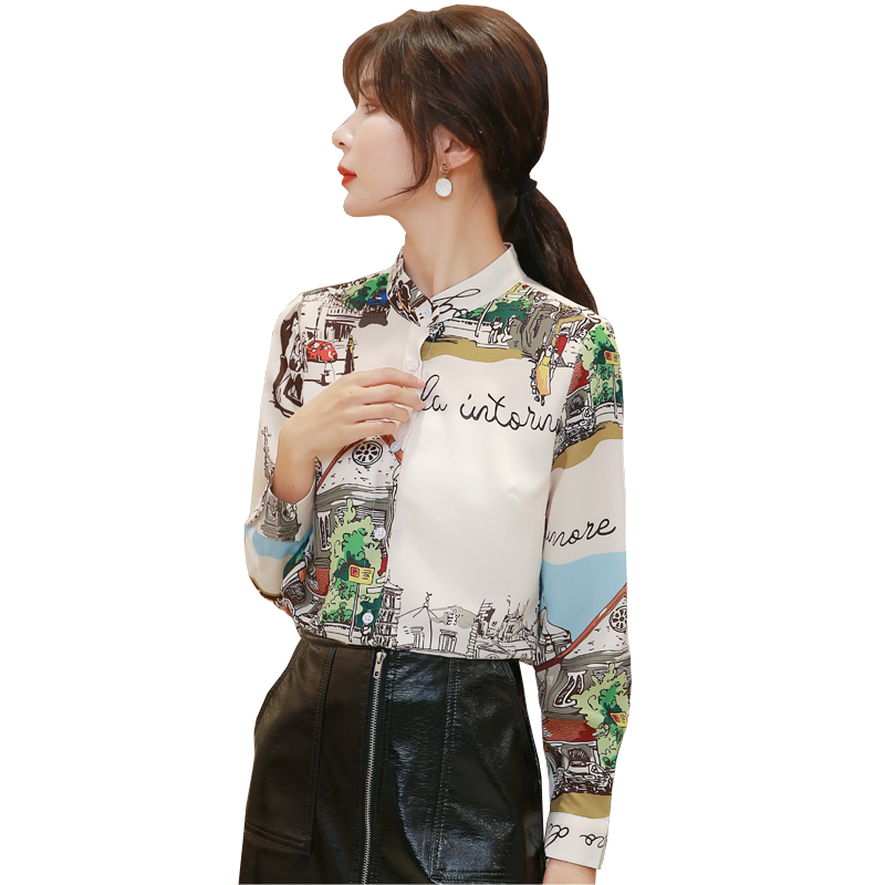 Busana Kemeja Dicetak Perempuan Rasa Desain Niche 2020 Baru Stand Up Kerah Wanita Baju Wanita Musim Shopee Indonesia